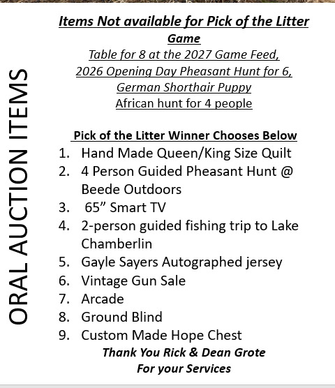 Oral Auction Wild Game Feed Oral Auction 2026 Gettysburg Fishing 2026 Click to print info on Arican Trip African Trip does not include Air Fair