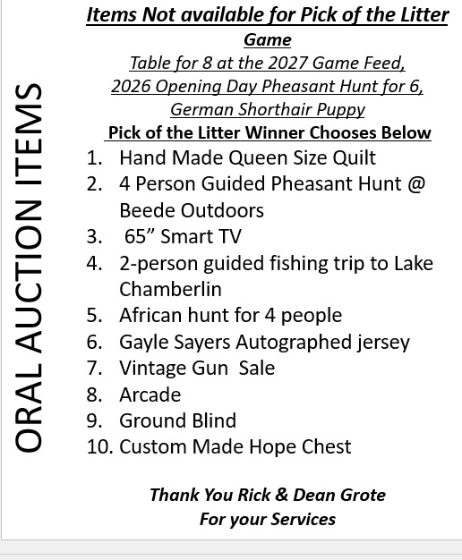 Oral Auction Wild Game Feed Oral Auction 2026 Gettysburg Fishing 2026 Click to print info on Arican Trip African Trip does not include Air Fair